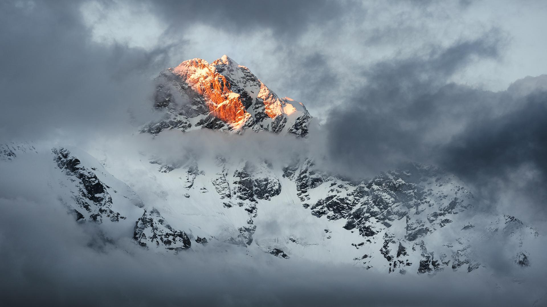 Večer přináší těžké mraky, zahaluje skoro celé hory, jen nad ledovcovým splazem Adishi zůstává permanentní okno. Na západě ale zůstává pruh jasné oblohy, slunko klesá a nakonec zpod mraků vykouzlí dramatickou scenerii plnou kontrastů. V sedle pod námi se objevují další dva stany, někdo měl podobný nápad zůstat na noc vysoko v horách. Máváme na sebe, užíváme si kavkazské představení. Tou dobou už je dávno pryč odpolední horko vystřídané skoro až mrazivým večerem. Když se zdá, že slunce nadobro zapadlo, trhají se mraky nad nejvyšší horou Gruzie Ušbou a slunce rozzáří její zasněžený vrchol oranžovou barvou.