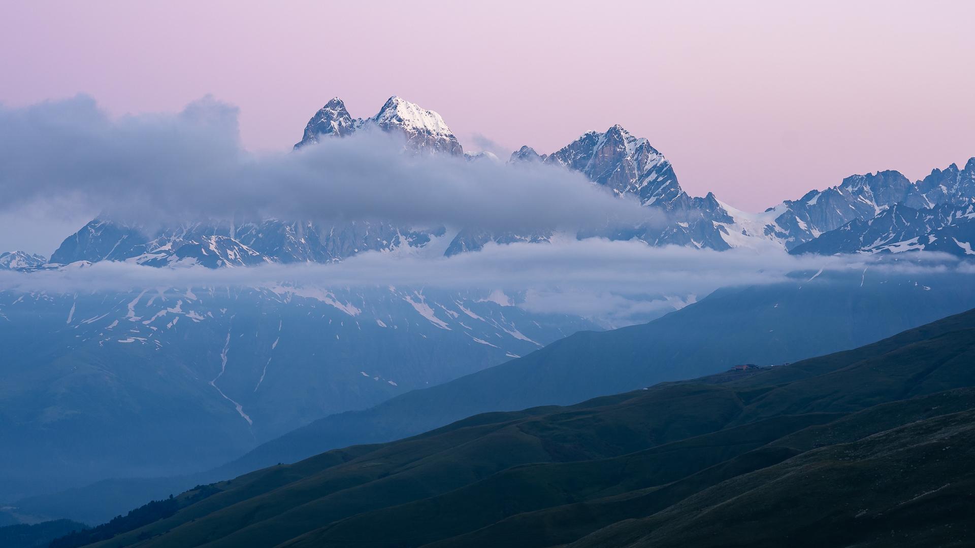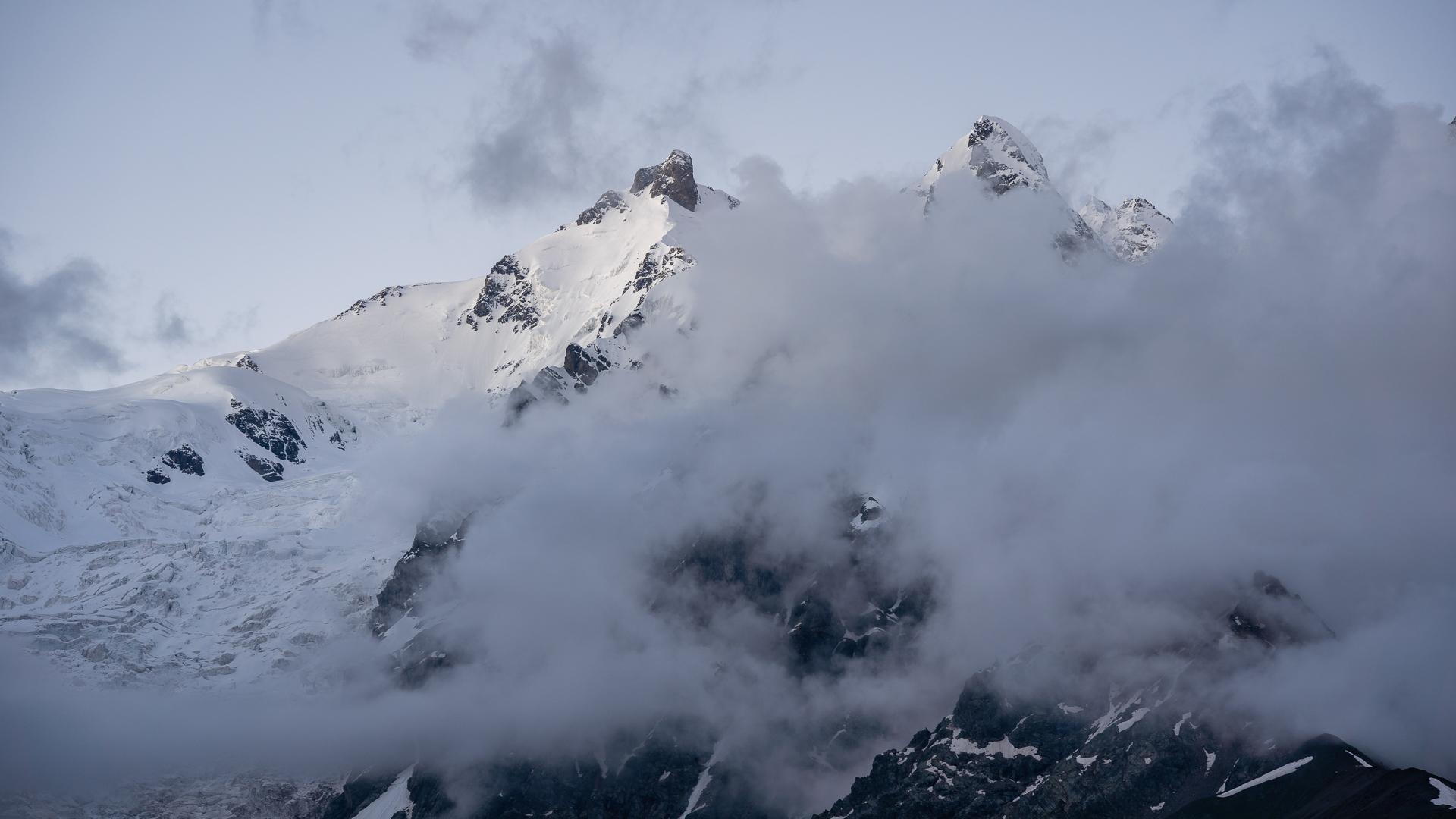Ráno se situace kompletně mění. Nebe se vyjasnilo, hradba bílých hor stojí přímo před stanem nerušená jediným oblakem. Daleko vpravo už je vidět západní, nižší, vrchol nejvyšší gruzínské hory Šchary. Daleko vlevo, na západě, protrhává poslední mraky dvourohá Ušba, která rovněž přivítá první sluneční paprsky. Napravo v dálce dokonce vystupuje nad hradbou hor zdánlivě nepatrný západní vrchol Elbrusu. Je mrazivo, cítím chlad v konečcích prstů, ale zůstávám venku. Ze stanů v sedle pod námi také vykukují první nocležníci, aby si užili východ slunce.