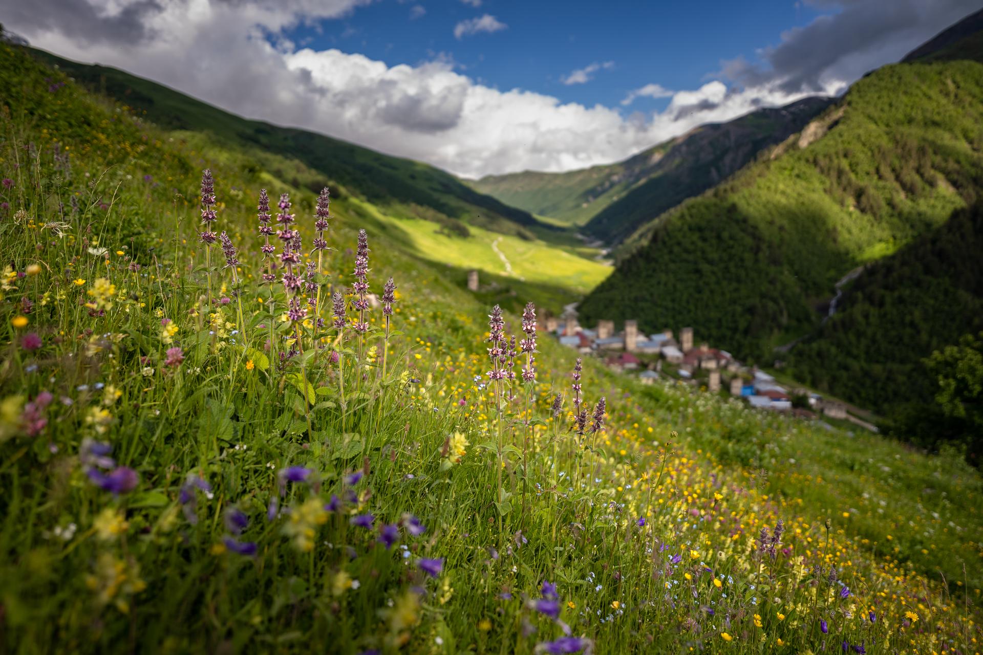 Zatím zde ale svítí slunce, loučíme se a stoupáme vstříc horám. Necháváme za sebou údolí plné kamenných věží i stáda krav, nad lesem začínají rozkvetlé louky. Snad je to jižní orientací gruzínské části Kavkazu, že jsou zdejší louky tak bohaté. Nevím, jestli jsem někde jinde viděl tolik vzrostlých bylin s květy všech barev, patrně až zde. Nad loukami se objevují první zasněžené vrcholy, kdesi na jihovýchod od nás, ty nejvyšší hraniční hory jsou ale stále ještě skryté.
