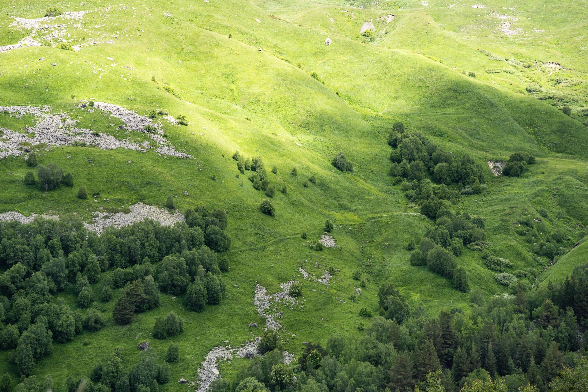Začíná brutální sjezd dolů, vidíme klikatící se cestu hluboko v údolí pod námi. V mapě je značená jako hlavní cesta, ale silnicí se dá nazývat jen těžko. Brodíme potoky, rozbahněné vyjeté koleje. Kdyby bylo po dešti, pravděpodobně bychom neprojeli. Auto skáče na kamenech, vrže při každém větším poskočení, ale přesně k tomuto účelu bylo sestrojeno. V místech, kde horské louky přechází ve vzrostlou kavkazskou vegetaci, se cesta láme. Nejhorší máme snad za sebou. Projíždíme bujnými březovými háji, porosty bolševníků a kopřiv.