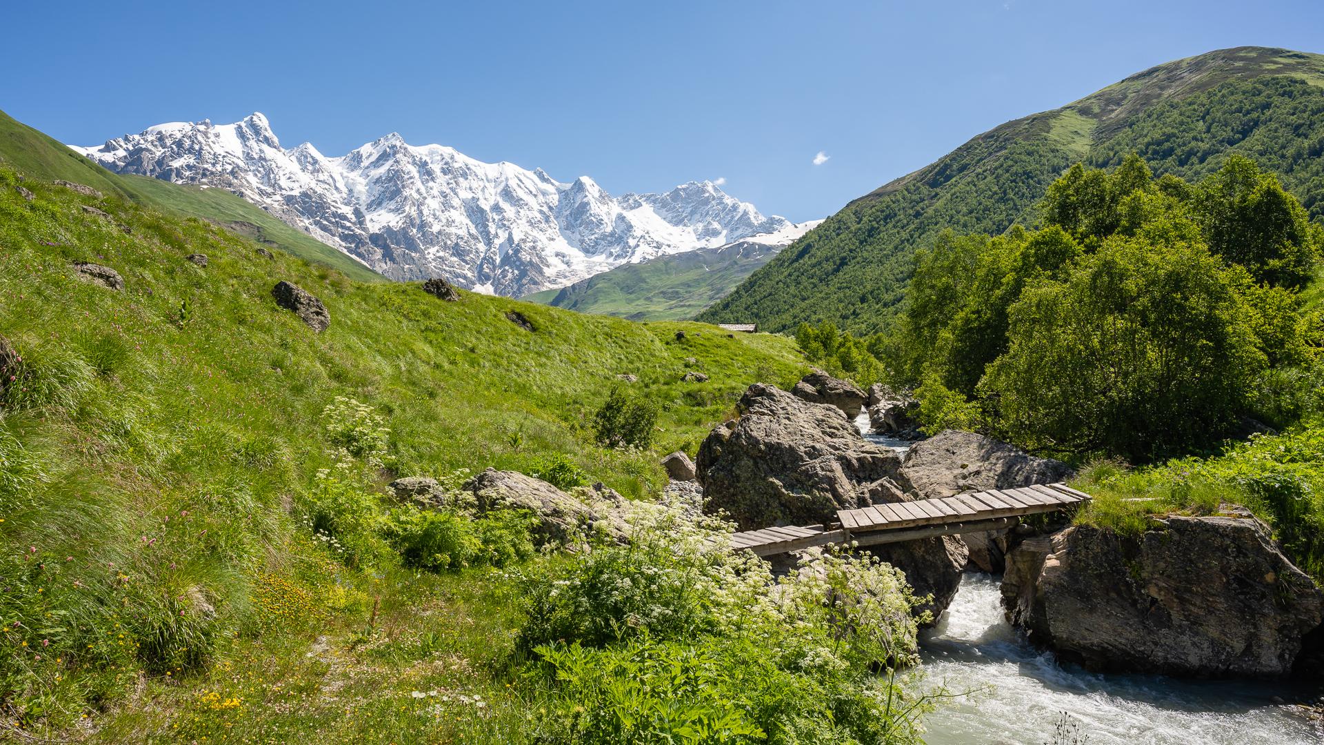 Trek z Adiši pokračuje pohodlně údolím, podél divoké řeky tekoucí z bělostných ledovců. Než se ale objeví ledovce před námi, vystoupí na opačné straně nad zelené stráně vrchol Ušba, symbol svanských hor. Když se údolí rozšíří, přímo nad ním se rozzáří bělavé vrcholy tak blízkých, a přitom prakticky nedosažitelných čtyřtisícovek. V ranním slunci se proti rozkvetlým stráním blyští přímo ukázkově.