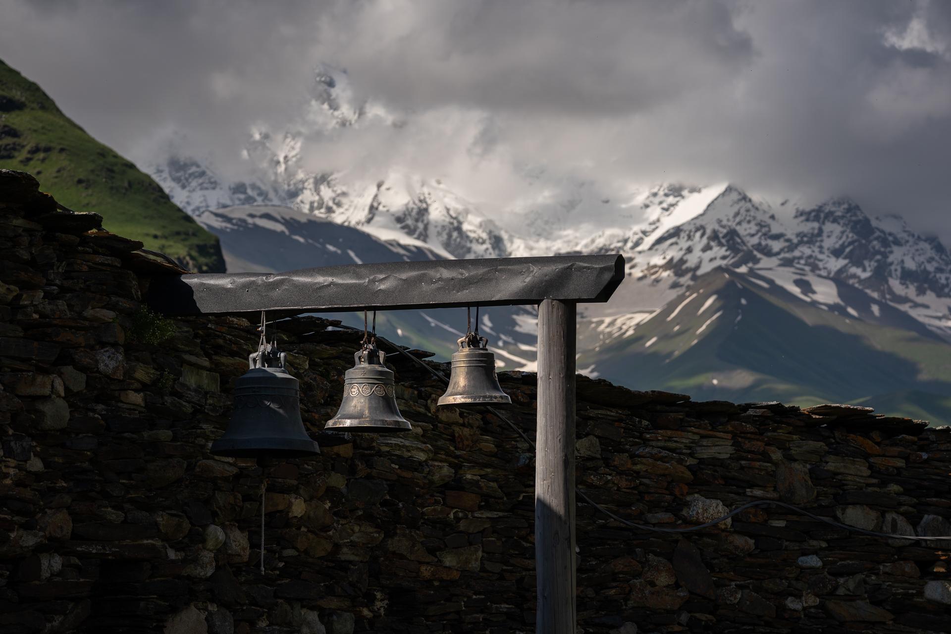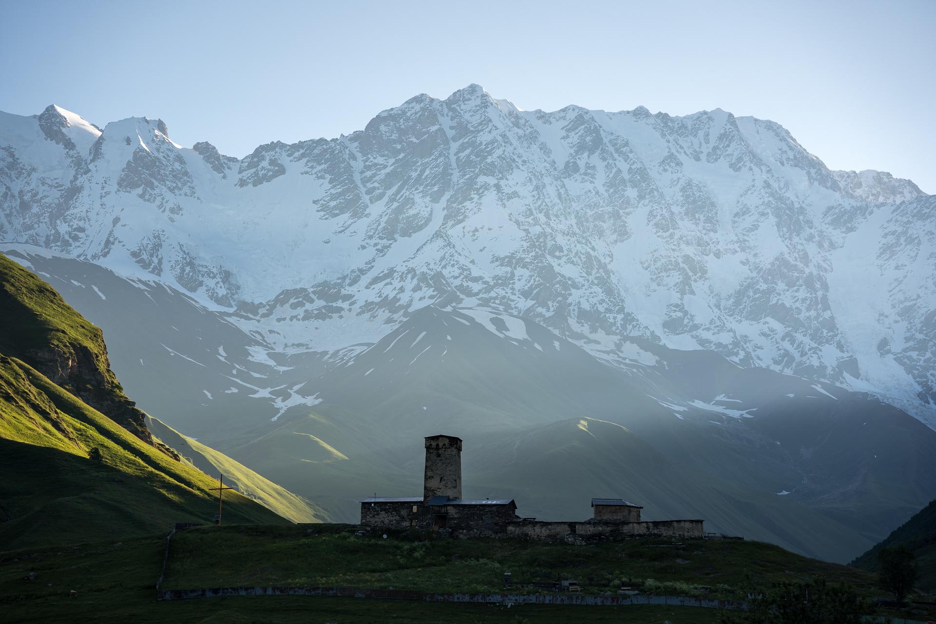 V noci zkouším zachytit věže proti nočnímu nebi, ale elektřina už funguje a Ušguli je až absurdně nasvícené. Ráno chystá lepší podívanou, Šchara je vidět celá a blyští se na slunci. Pokračuji ke kostelu Lamaria, odkud se otevírá výhled na celé údolí až k hraničním vrcholům. Celou dobu mě doprovází dva psi, na což je potřeba si v místních vesnicích zvyknout.