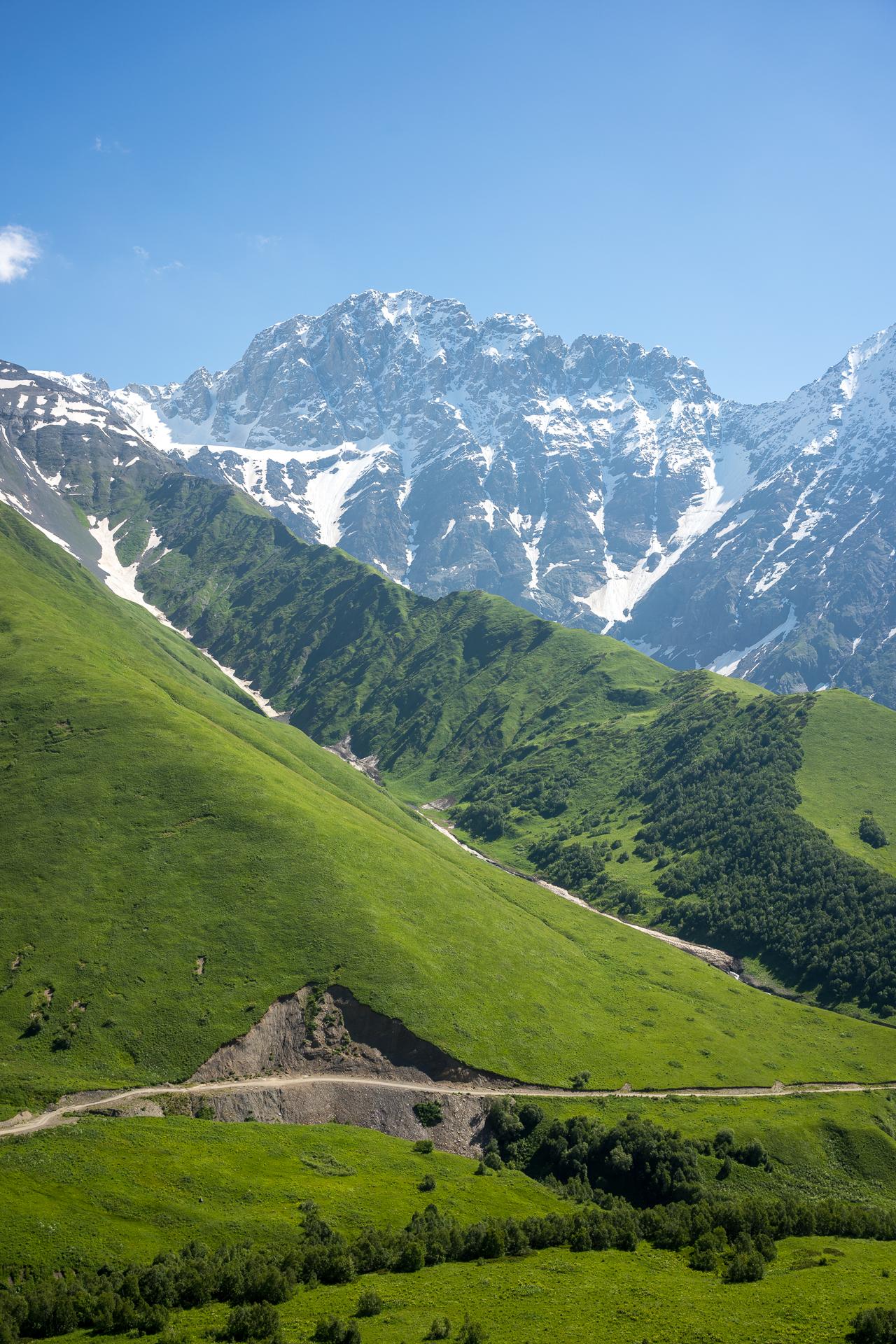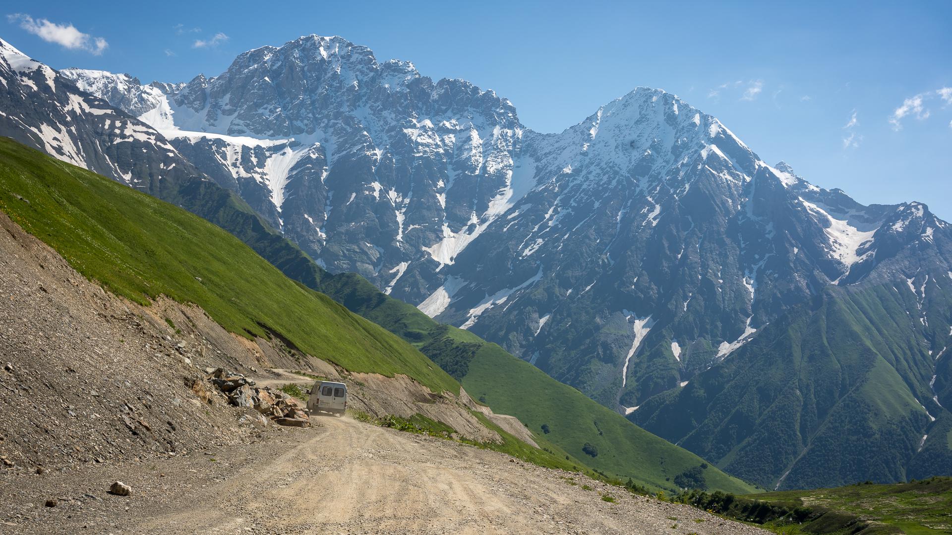 Cesta se vine po úbočích nad Ušguli, po stráních se zbytky sněhu až do výšky přes 2600 metrů, do samotného sedla Zagaro. Tady se znovu (a naposledy) otevře úchvatný pohled na zaledněné vrcholy na hranici Gruzie. Ční tak vysoko nad námi, že je potřeba se naklonit dopředu, aby pohled na ně nezakrývala střecha auta.