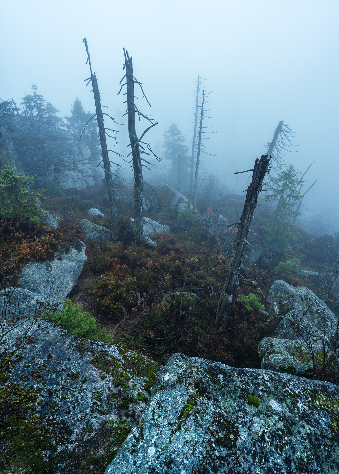 The area around the summit of Hochstein no longer resembles the landscape of a dead forest that prevailed here until quite recently. New green trees are growing, and soon there will be no trace of the old ones. However, some of the magic remains under the main rock, with a few dead trees standing among the boulders, their appearance complemented by the fog. One of the spots here offers a composition in which the rocks literally embrace the remaining trees.