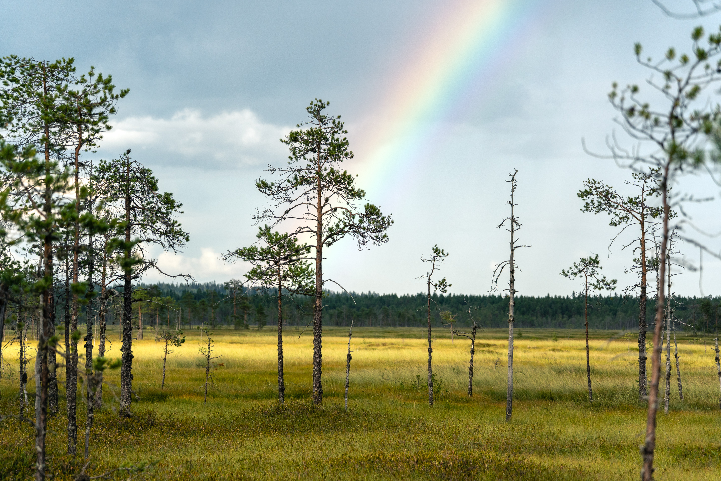 My first encounter with the flat plains of the Patvinsuo wetland is a perfect one. An afternoon storm conjures up a rainbow on the horizon, while the golden sun finds its way through the clouds to the grass and sparse pine trees in places.