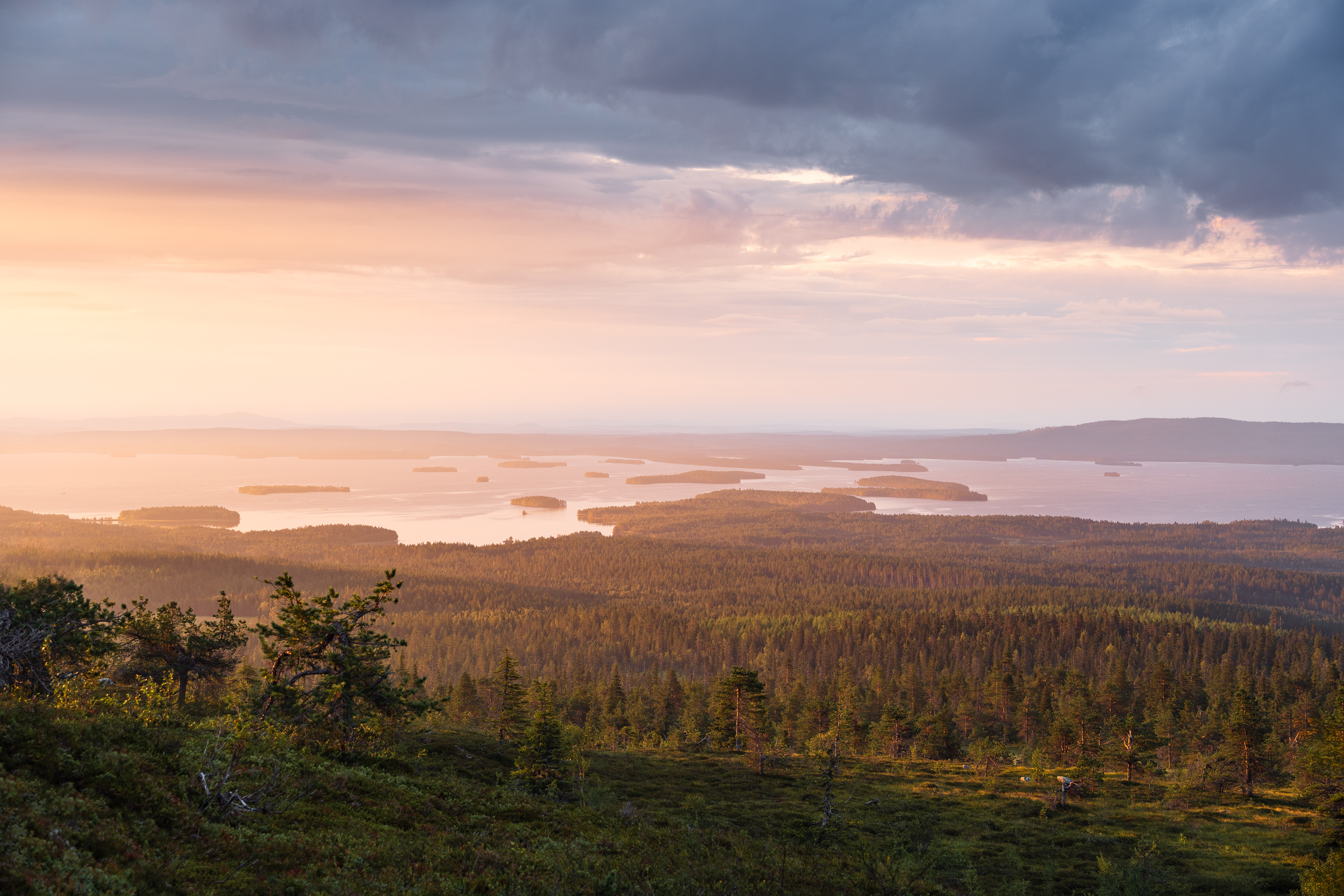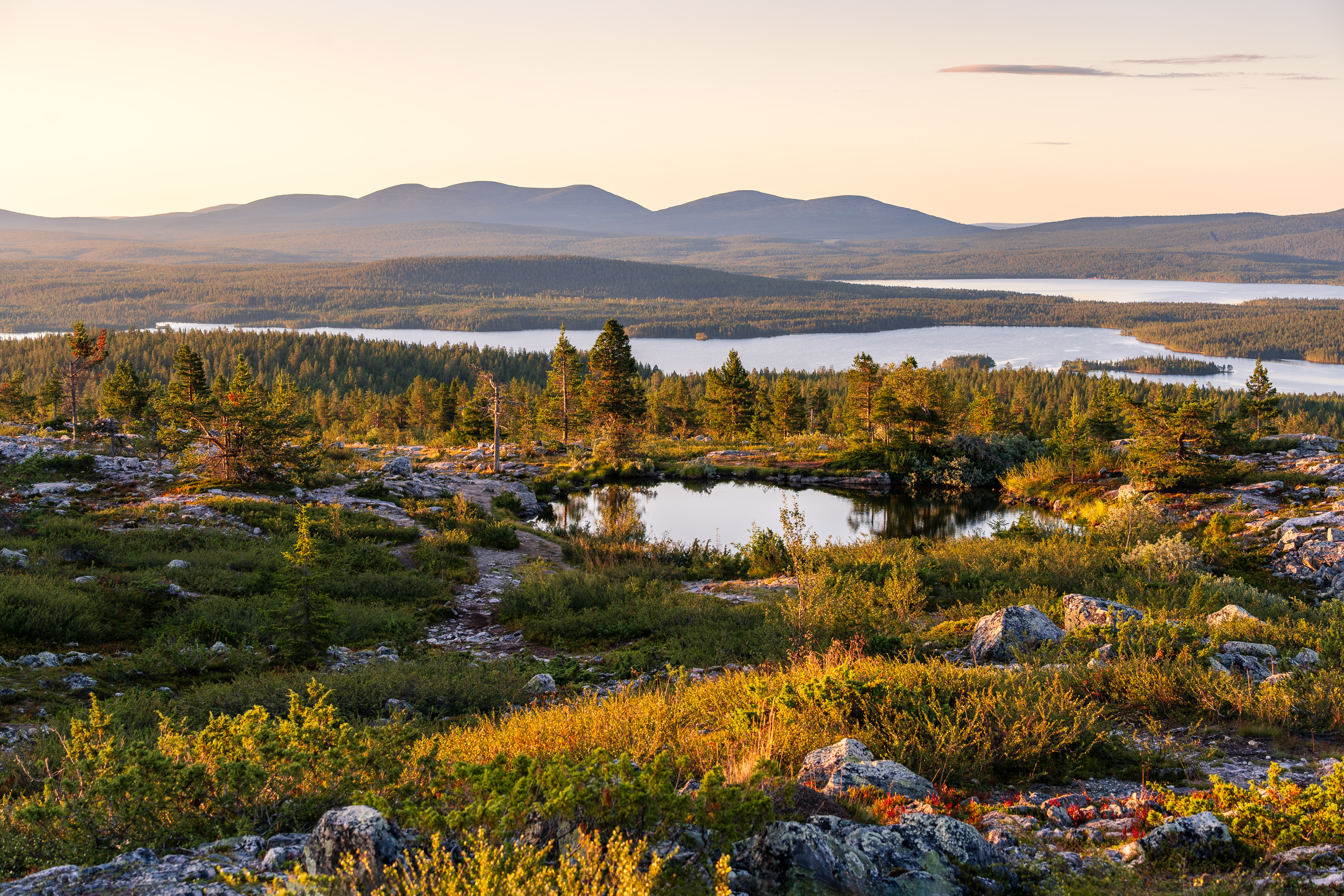 The blue surfaces of the lakes stand out among the wooded hills. The landscape here in the north is literally endless. The horizons stretch far into the distance and there are few traces of civilization. Summer evenings in the landscape near Pallas-Yllästunturi in Lapland are pleasant and peaceful, like the rest of the country.
