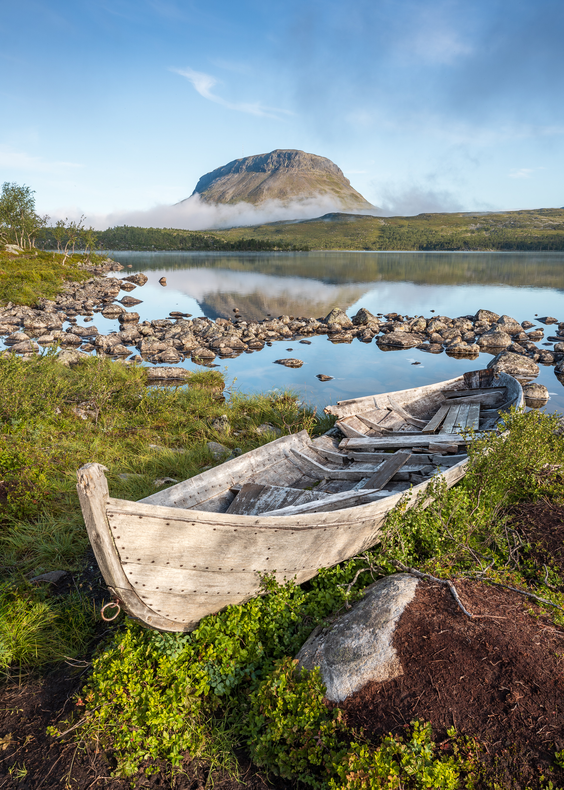 A decaying wooden boat pulled ashore on Lake Tsahkaljärvi, with the sacred mount Saana behind it, whose shape also resembles a boat turned upside down. The sun dissipates the fog over the lake in a matter of moments, but fortunately the fog remains exactly where it should be—on the opposite side of the lake below Saana. At that moment, the mountain looks like a ship majestically emerging from a sea of clouds.