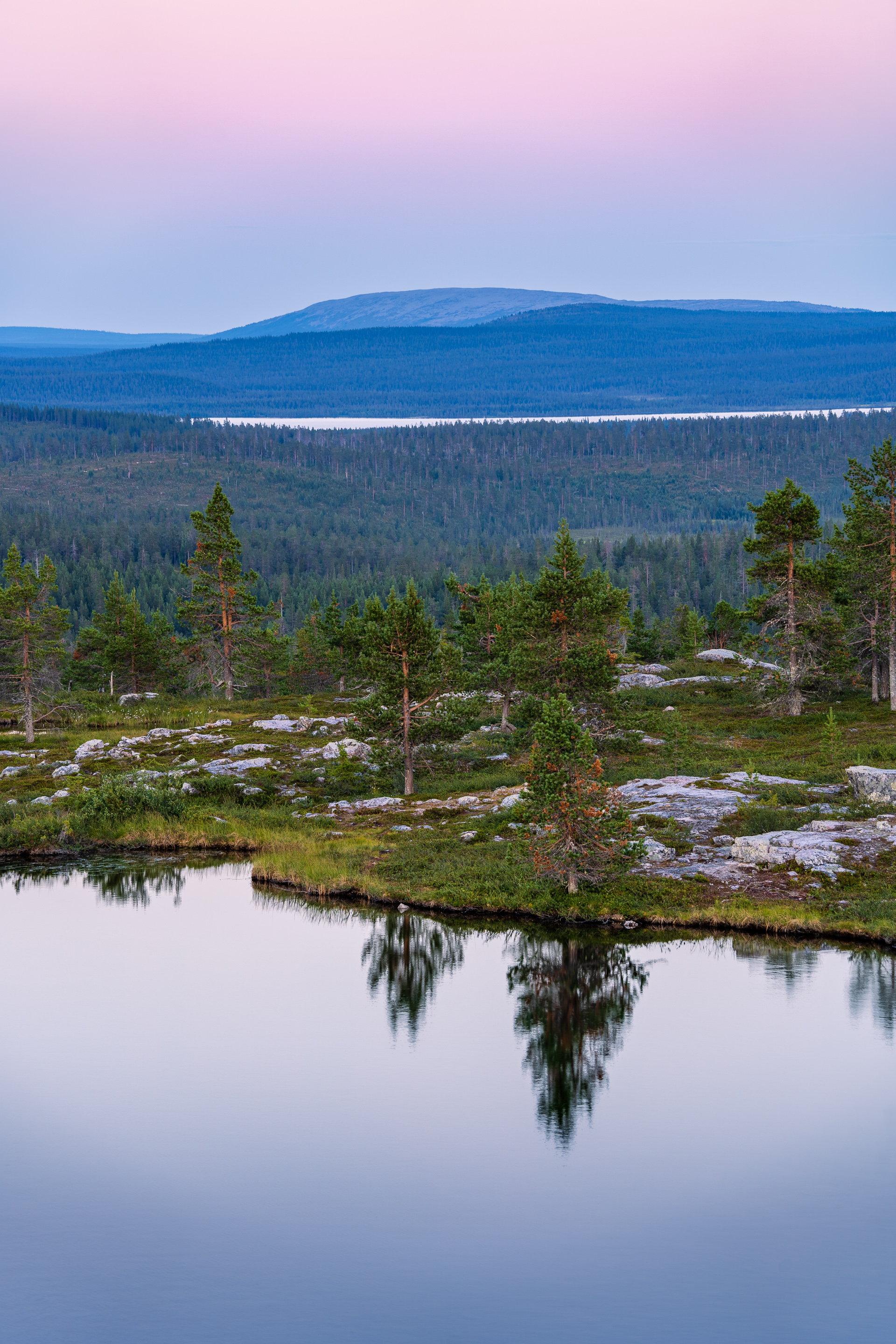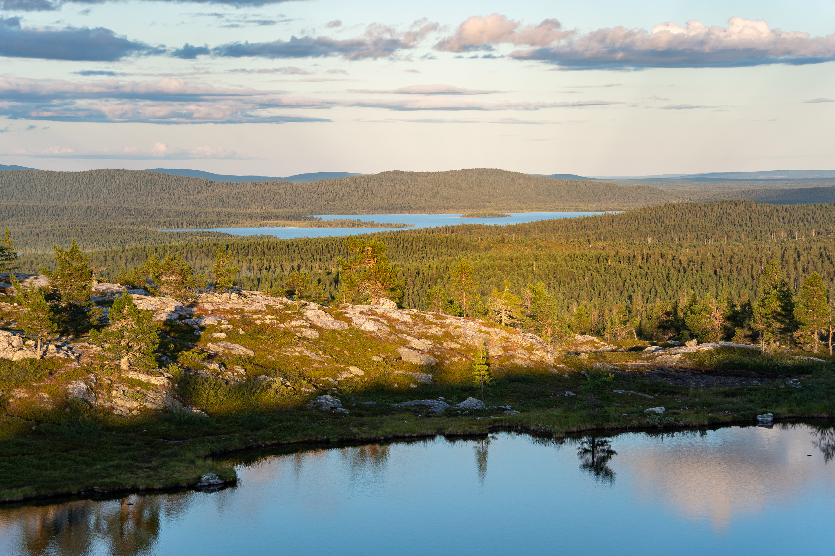 There are several small lakes at the top of Särkitunturi. The first one is the most interesting, located where the forest ends on the slopes of the mountain. Its surface emphasizes the vastness of the landscape in contrast to the distant lakes and the Pallas-Yllästunturi hills on the horizon. The evening light softens the shadows and shifts the forest landscape towards warm shades of color.