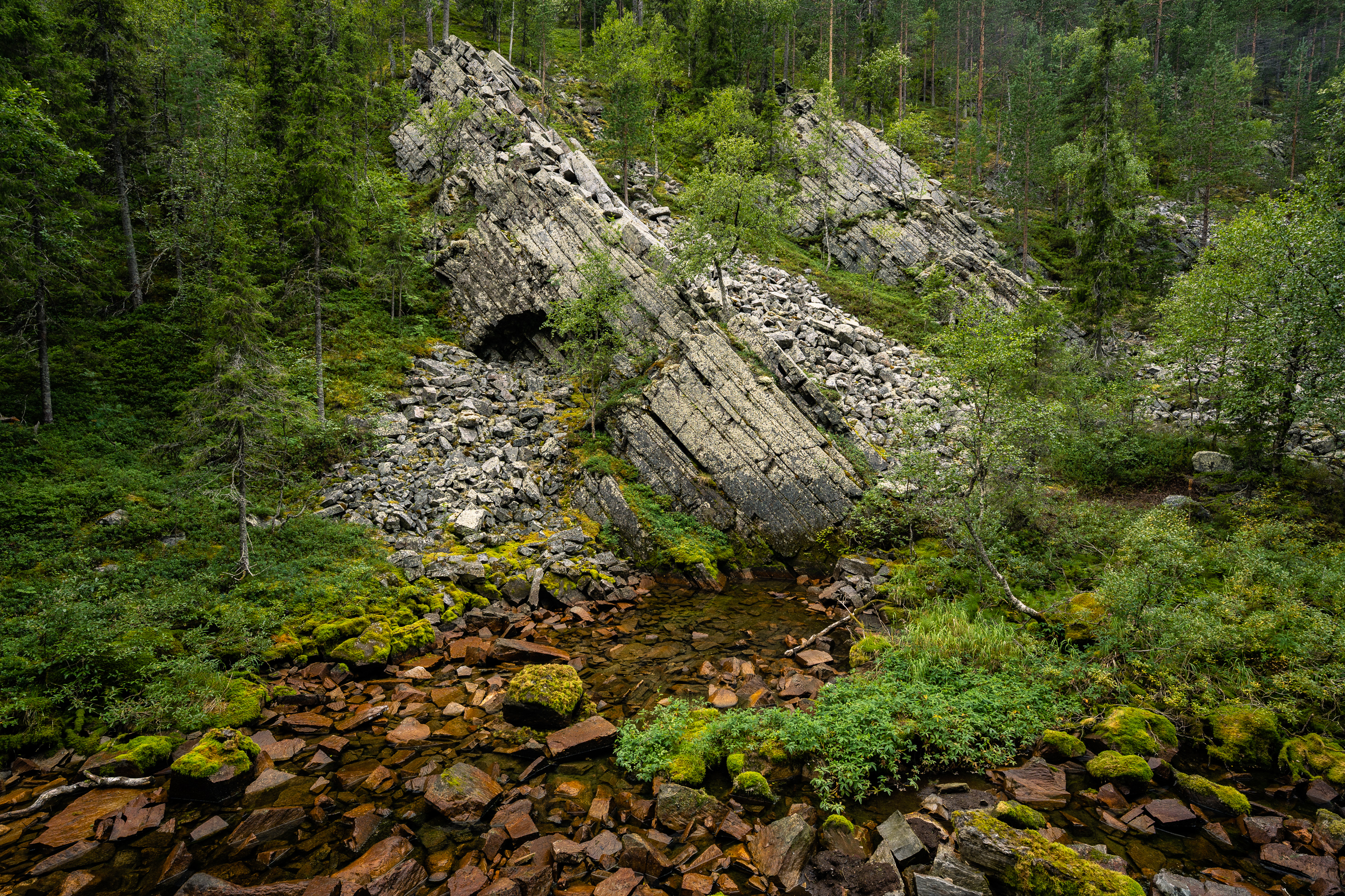 The rocky slopes of Kultakero and Noitatunturi meet at the bottom of the Isokuru gorge, creating a wild backdrop of water and lush vegetation. The surrounding mountains are among the oldest in the world. Once resembling the Alps or the Himalayas, today they are only remnants of the hardest rock from the cores of the original mountain ranges.