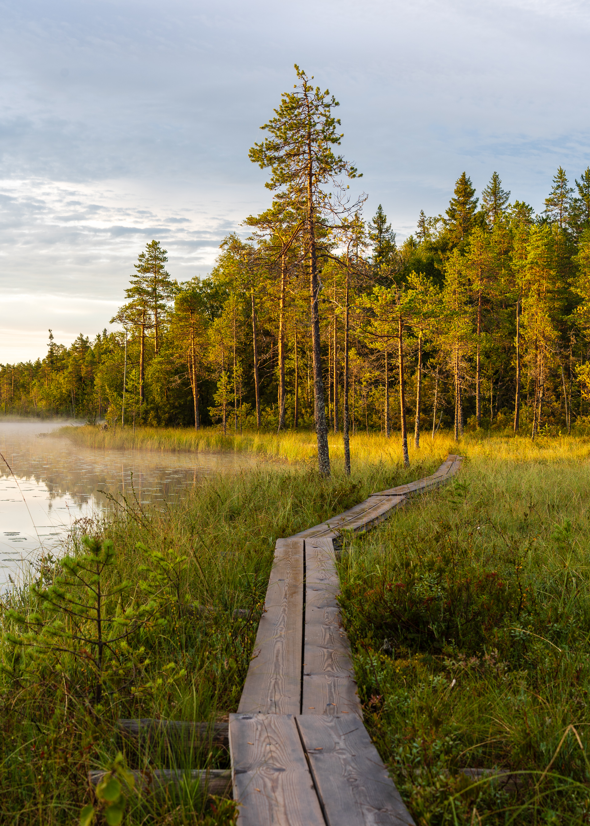 The Pieni Koirajärvi lake is surrounded by a trail made up of wooden walkways. As the morning progresses and the fog slowly disappears, I focus on the immediate surroundings of the lake and the sunlit edge of the adjacent forest. In this case, the walkway is not a hindrance; on the contrary, it offers a new compositional element for the photograph.